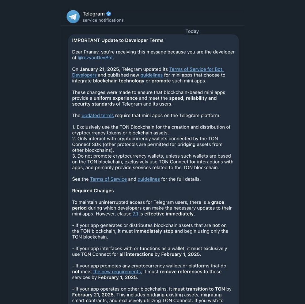 - January 21, 2025: All new TON apps must adhere to TON-only rules under Clauses 7.1–7.4 of the Telegram TOS.